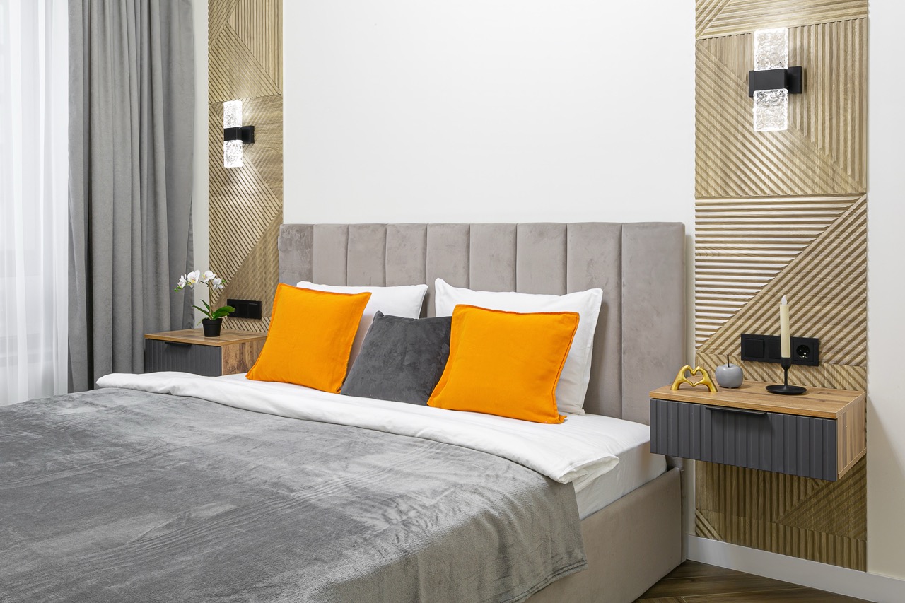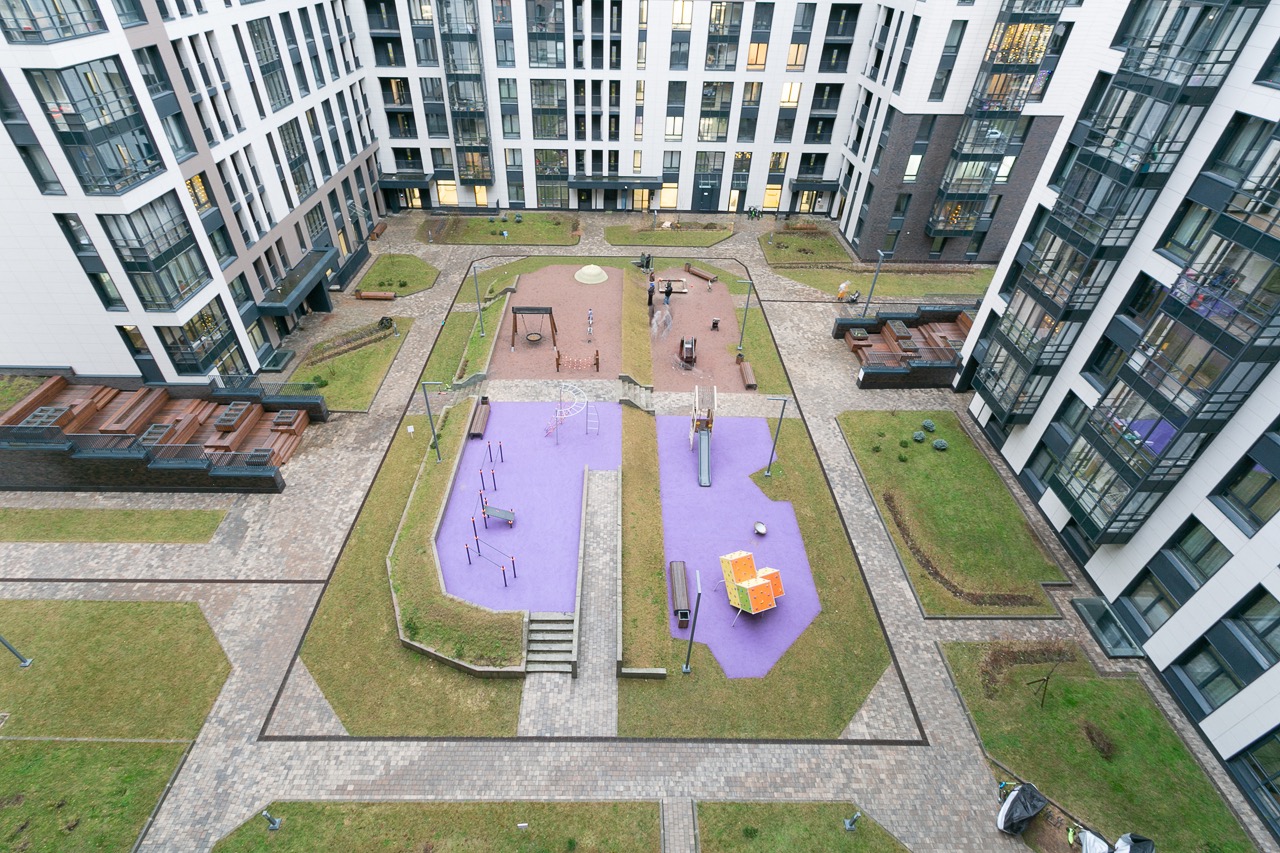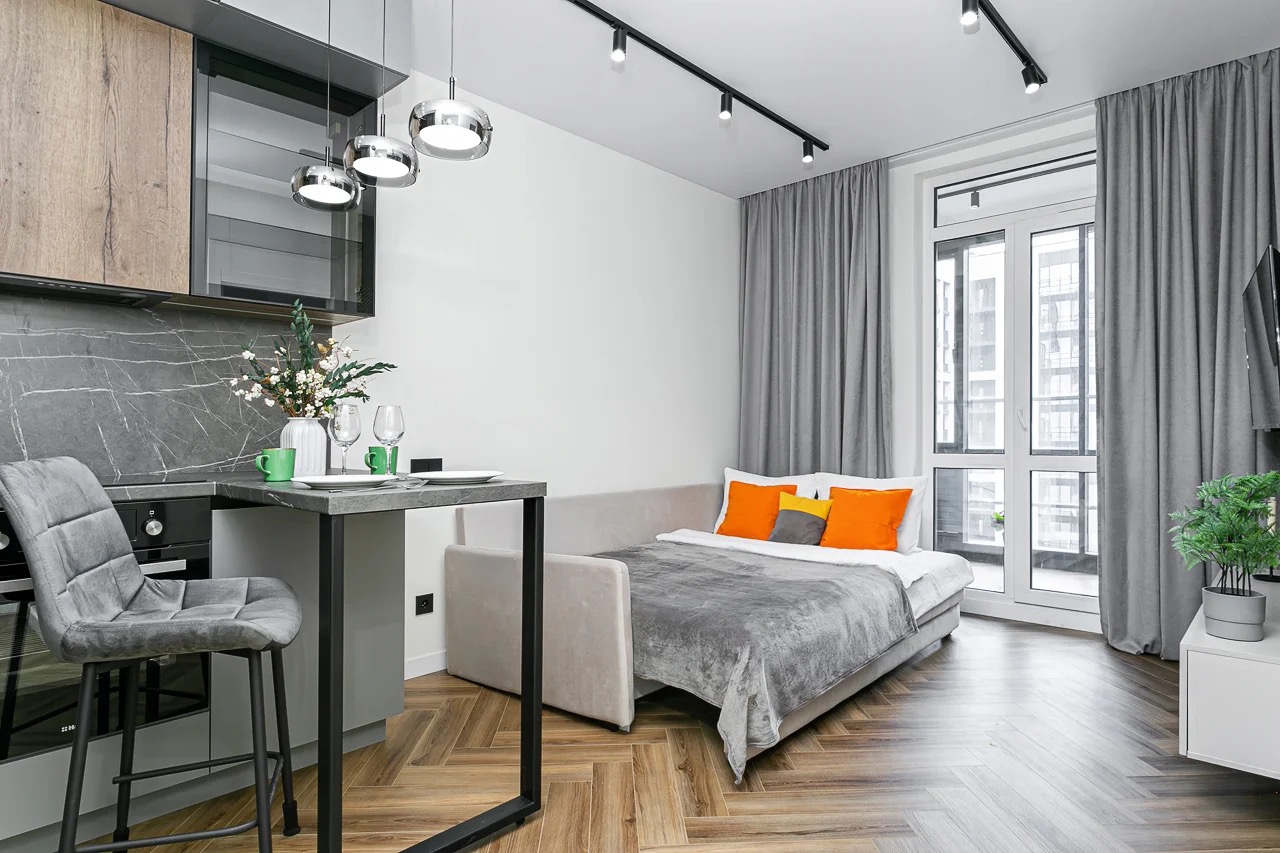 Заселение бесконтактное — приехали, поднялись на 8 этаж (лифт есть) и сразу в свой ритм. В комнате двуспальная кровать 160 см и диван, есть балкон и тёплый пол — мелочь, которая зимой решает. Окна выходят во двор, так что утро начинается спокойно, без городского фона.